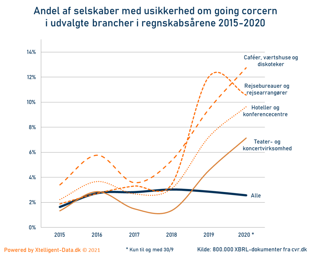 Som udgangspunkt skal man være varsom at udlæse Coronakrisen fra årsrapporterne. Det skal tilskrives det simple faktum, at de hårdest ramte selskaber ophører, og derfor slet ikke indsender årsrapport. Med dette forhold in mente, har jeg alligevel set på udviklingen i usikkerhed om going concern, for en række at de mest berørte brancher. Regnskabstal for selskaber med balancedato d. 31/12 foreligger først i løbet af august/september 2021. Derfor indgår kun de selskabers årsrapporter med balancedato d. 30/9-2020 eller tidligere i analysen.