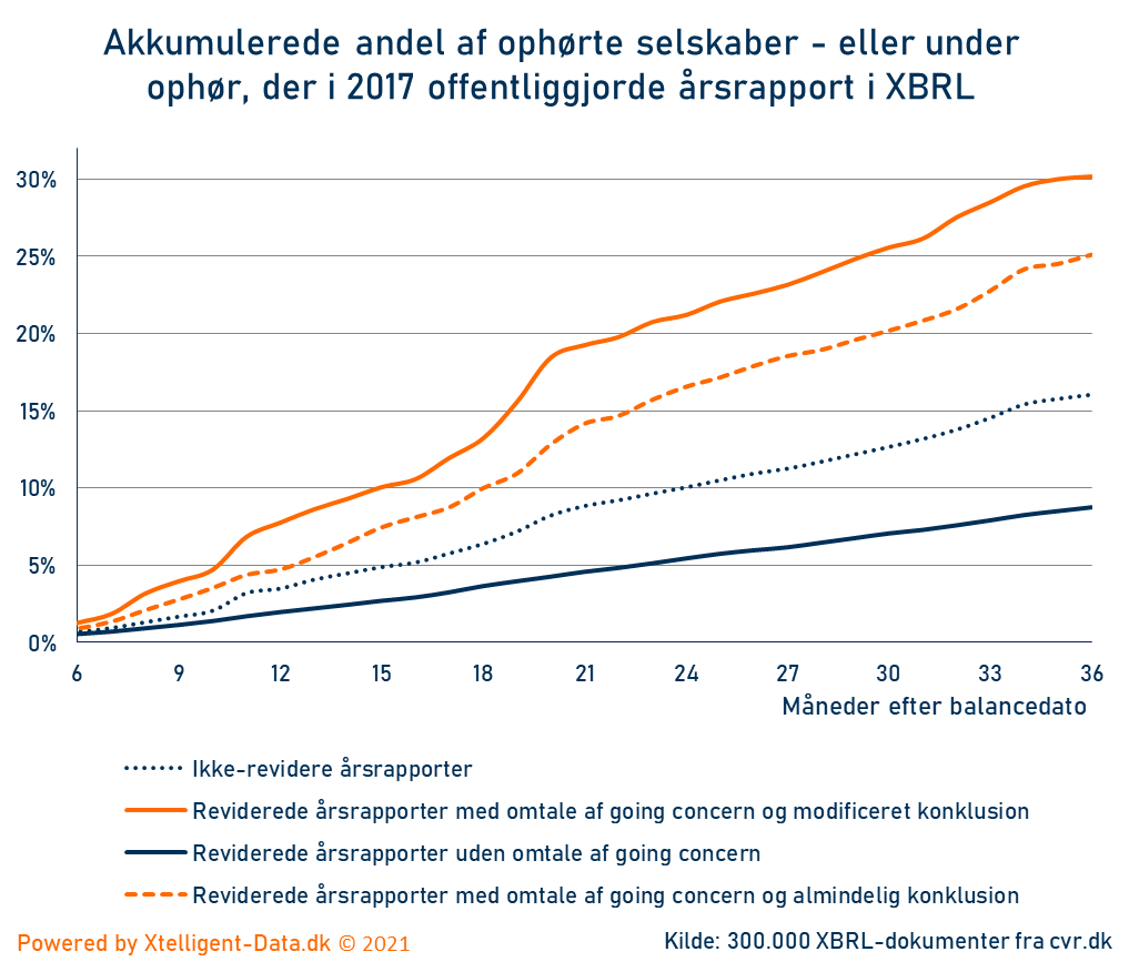 36 måneder efter balancedatoen, er kun 8 % af de reviderede selskaber UDEN usikkerhed om going concern ophør eller under ophør. For de reviderede MED usikkerhed om going concern og modificeret konklusion, er 31 % ophørt eller under ophør efter 36 måneder.
