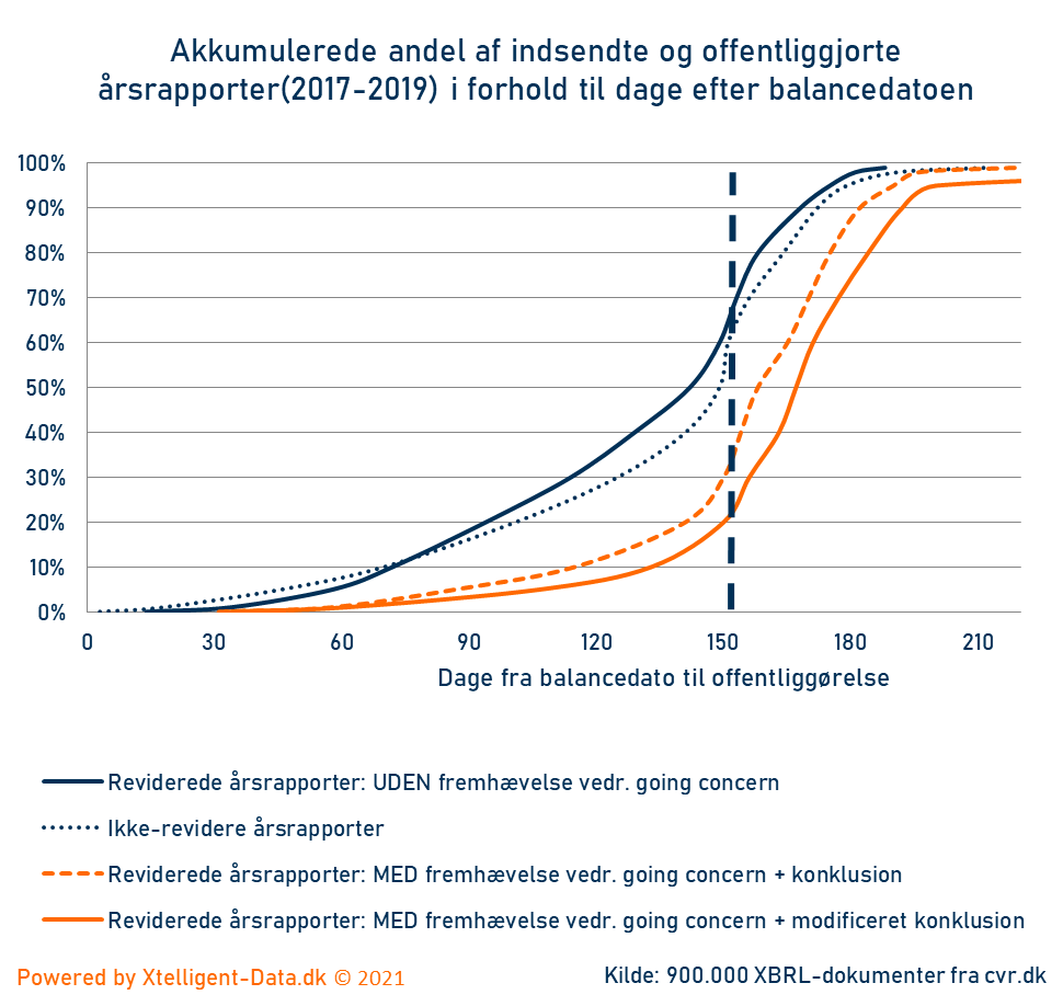 I de seneste 3 år (før de Coronarelaterede fristudsættelser) ses et tydeligt sammenhæng mellem indsendelse og usikkerhed vedr. going concern. Således indsendes ca. 70 % af reviderede årsrapporter UDEN usikkerhed om going concern rettidigt. For de reviderede MED usikkerhed om going concern og en modificeret konklusion var det tilsvarende tal kun 23 %.